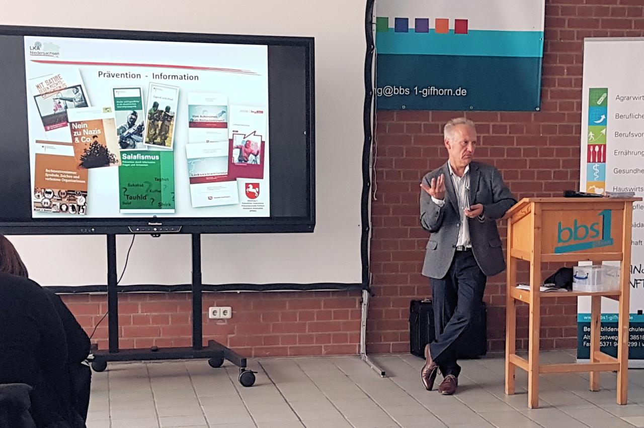 Was ist Rechtsradikalismus und wie begegne ich ihm? Solche Fragen mögen für Erzieher und sozialpädagogische Assistenten zunächst weit weg sein. Bei näherer Betrachtung sind sie für diese Berufsgruppen aber besonders wichtig. Denn „als Extremist wird man nicht geboren – man wird dazu“ weiß Kriminalhauptkommissar Andreas Ostwaldt. In seiner Arbeit für das Landeskriminalamt Niedersachsen hat er schon viele Fälle von politischem Extremismus gesehen und den Werdegang von Extremisten verfolgt. So zeigte er zusammen mit Stephan Meinke bei einer Veranstaltung am 19. September 2019 an der BBS1 rund 120 Schülern der Berufsfachschule und der Fachschule Sozialpädagogik, wie sie junge Menschen erkennen, die in den Extremismus abgleiten und welche Präventionswege ihnen zur Verfügung stehen.