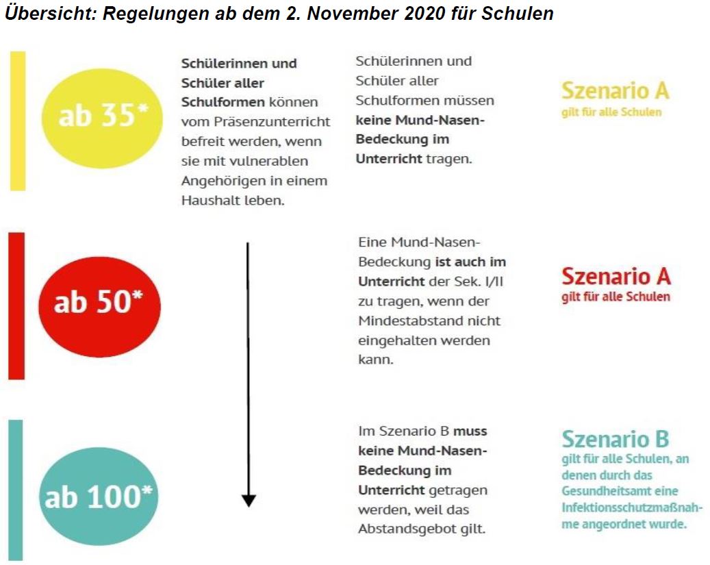 Wenn der Inzidenzwert höher als 100 ist, wechseln alle Schulen, für die das Gesundheitsamt eine Maßnahme zum Infektionsschutz angeordnet hat, ins Szenario B. Das bedeutet: Die Klassen werden wieder geteilt und es kann wieder Abstand gehalten werden. Diese Regelung gilt so lange, wie die Maßnahme dauert (i. d. R. 14 Tage).