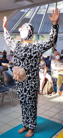 Von den Kolleginnen der Berufseinstiegsschule schnell in die Garderobe entführt, stand Frau Hucklenbroich nun in vollkommener Pracht im „KUH“ – Kostüm vor dem gesamten Kollegium. Aber das sollte nicht alles sein: Nun mussten zum Gefallen aller Eingeladenen unterschiedliche Yoga – Übungen nachgeturnt werden.