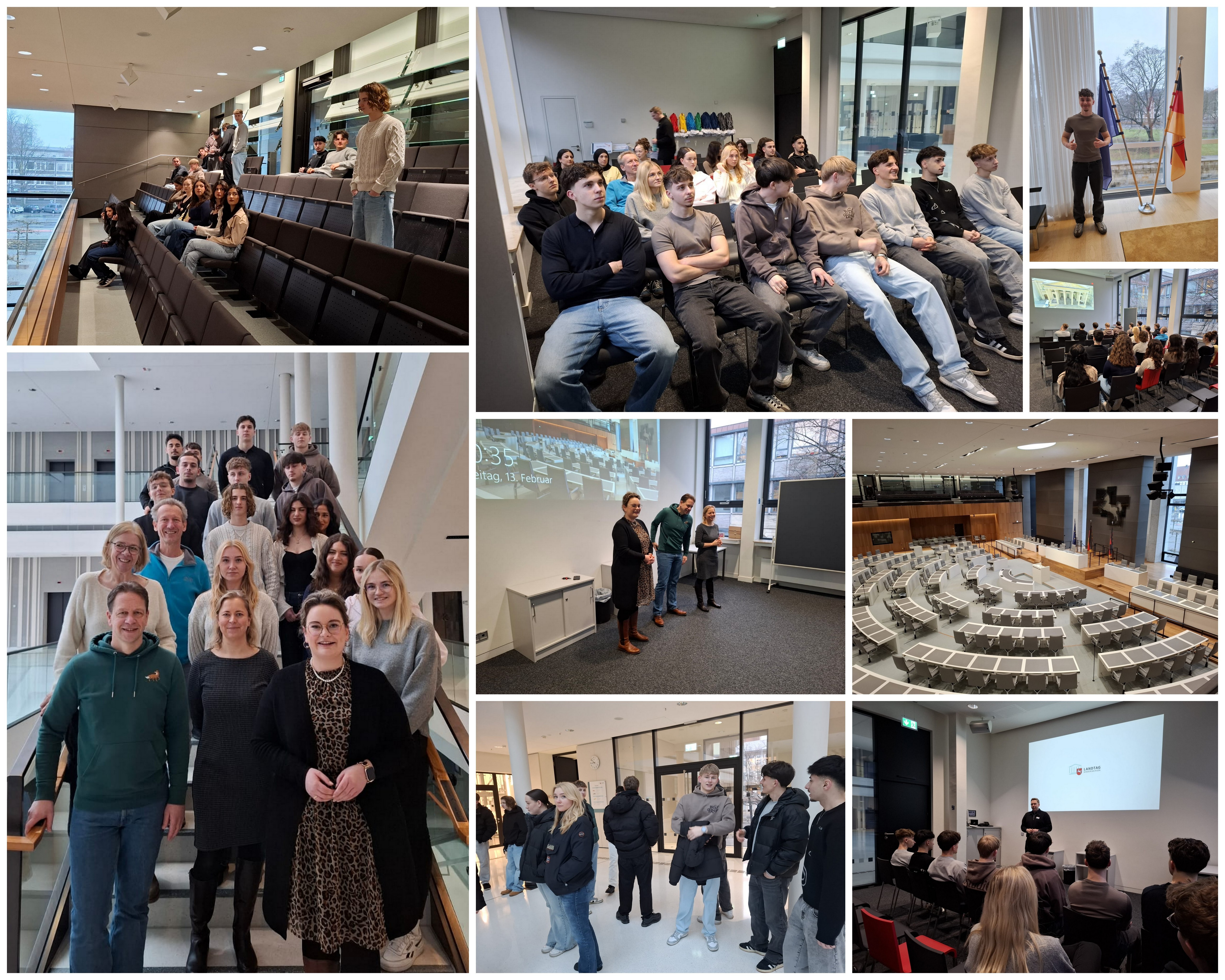 Begleitet wurde die Klasse vom Landtagslotsen Christoph Willms, der durch das Parlamentsgebäude führte und einen informativen Überblick über Abläufe, Aufgaben und Geschichte des Landtags gab. Während des Rundgangs konnten die Schülerinnen und Schüler die Arbeitsweise der Abgeordneten kennenlernen und einen Blick in die beeindruckenden Sitzungssäle werfen.